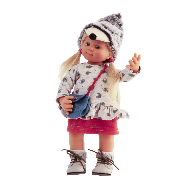 A denim blue bag worn over the shoulder, and a hat (hedgehog's head) complete her outfit.