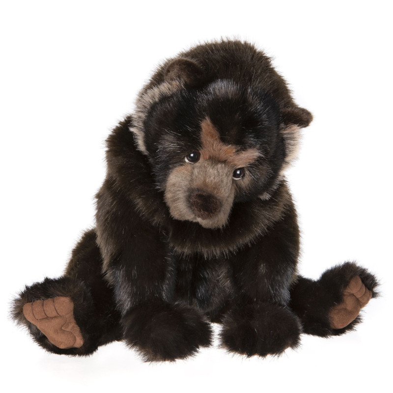 It is sewn from luxurious plush, sumptuously soft and shiny, with medium-length hair, shades of dark brown for most of its body; and light brown and red hair around its head and muzzle.