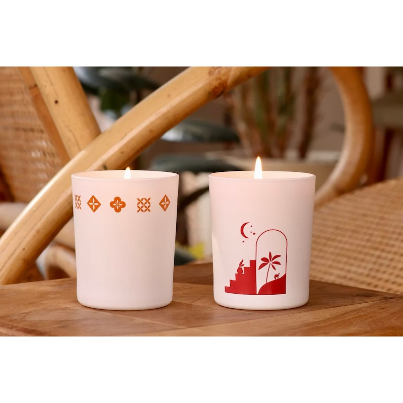Presented in a refined container (white glass jar, delicately decorated with Moroccan-style illustrations), these handcrafted candles are a decorative and inspiring object.