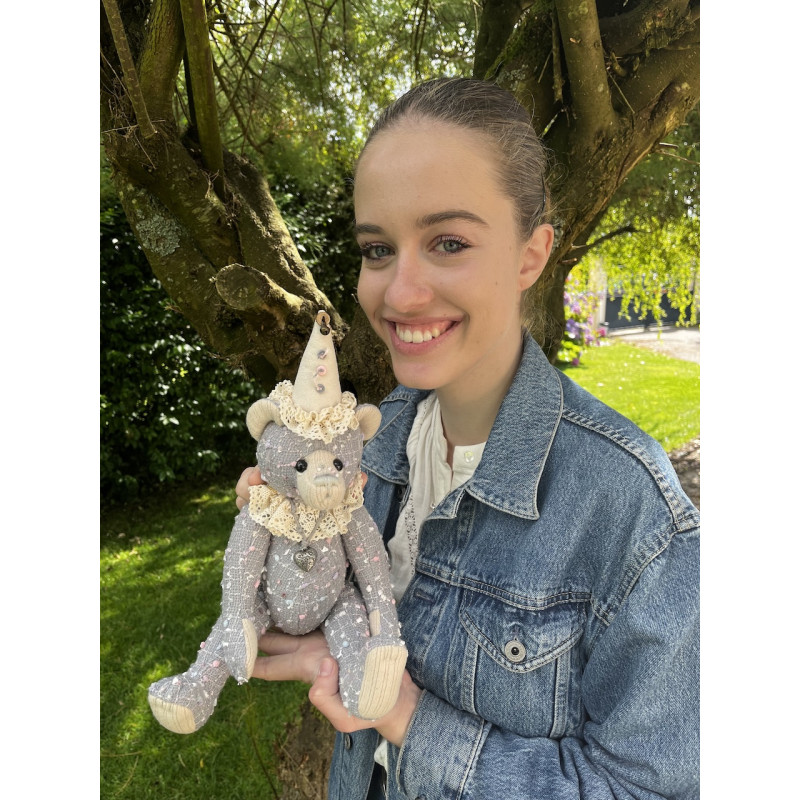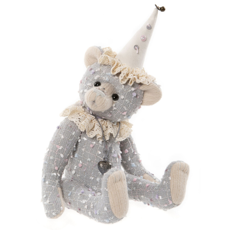 Cousu à partir de laine tissée luxueuse, aux nuances grises, l'Ours Serendipity se fera remarquer avec sa collerette et son chapeau de bouffon.