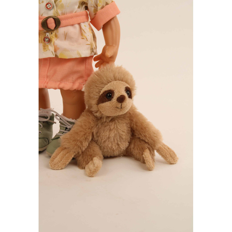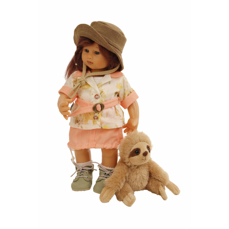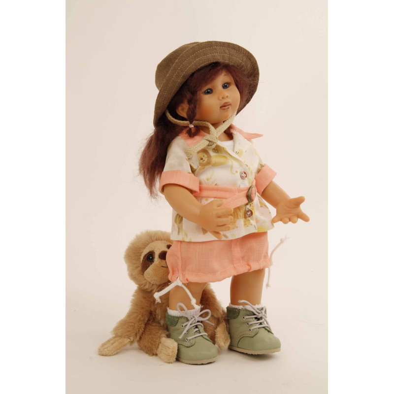 Un chapeau brun et une douce peluche complètent sa tenue.