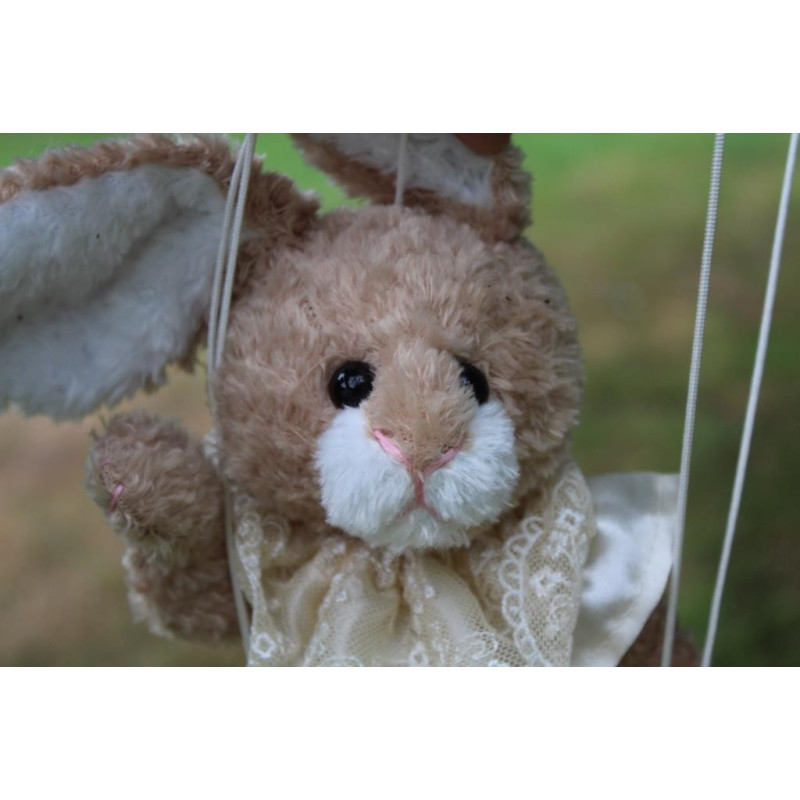 A la fourrure douce, texturée et bouclée, aux nuances caramel et blanc, la marionnette Adelphi ne pourra que vous émerveiller, grâce au fait qu'elle puisse être articulée par les différents fils et traverses en bois qui la feront bouger et danser.