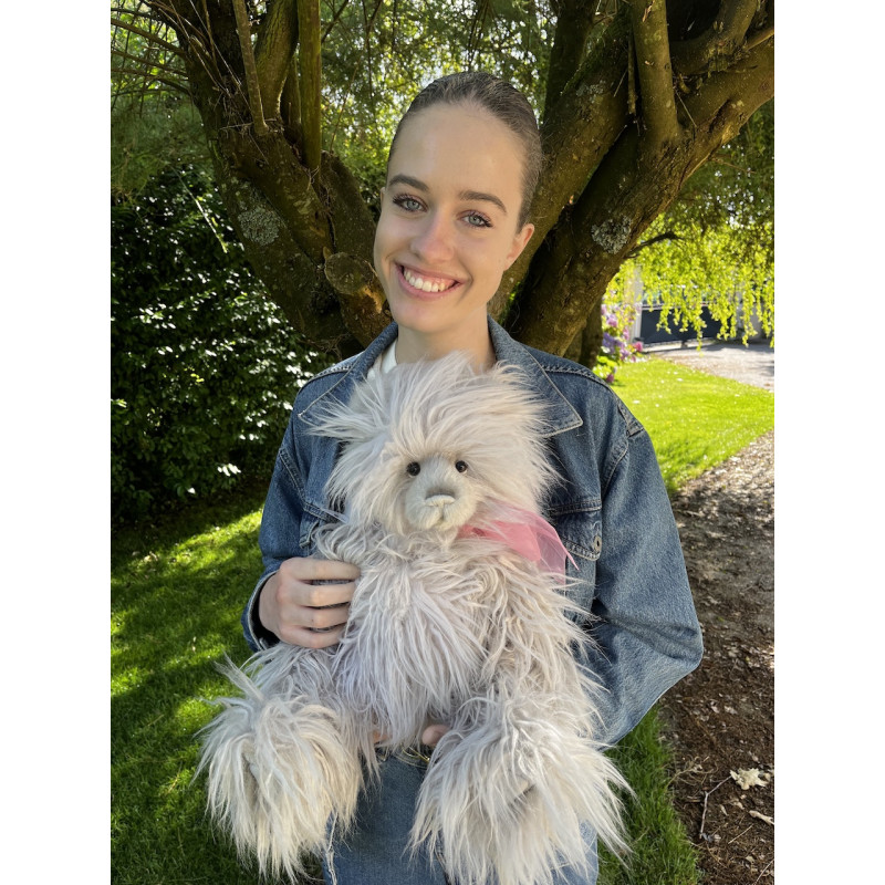 Confectionné dans une sublime peluche luxueuse à longs poils gris argenté, Chrissy a une fourrure dense et bouclée.