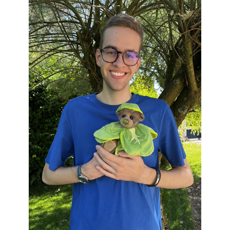 Fabriqué à partir d'une fourrure luxueuse très douce, aux nuances brunes, notre ours a des yeux brillants et un joli petit nez vert cousu à la main.