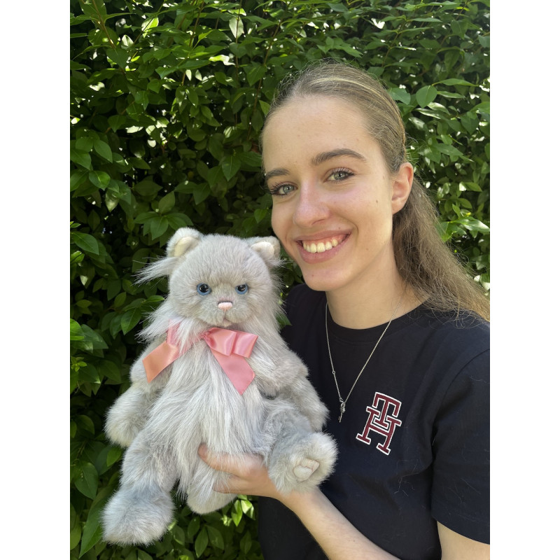 Son museau à poils ras, met en évidence son petit nez rose (cousu à la main) et ses yeux bleus très expressifs.