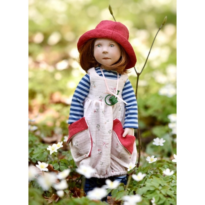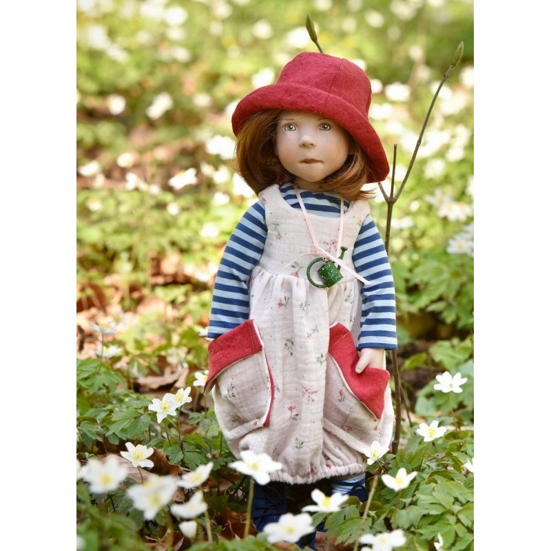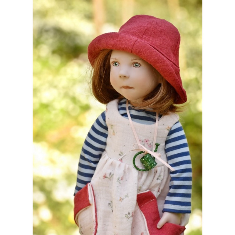 Elle porte un petit arrosoir autour du cou, et un beau chapeau rouge.