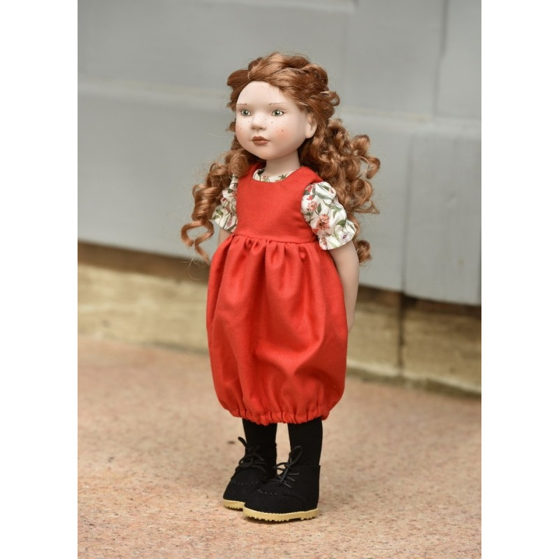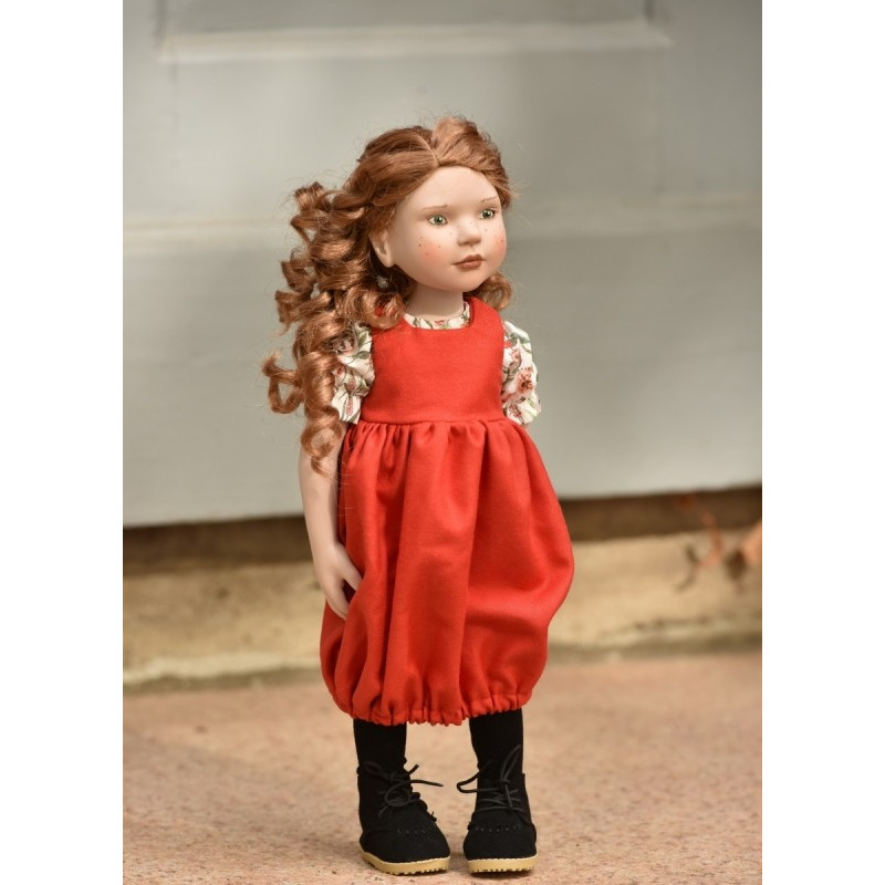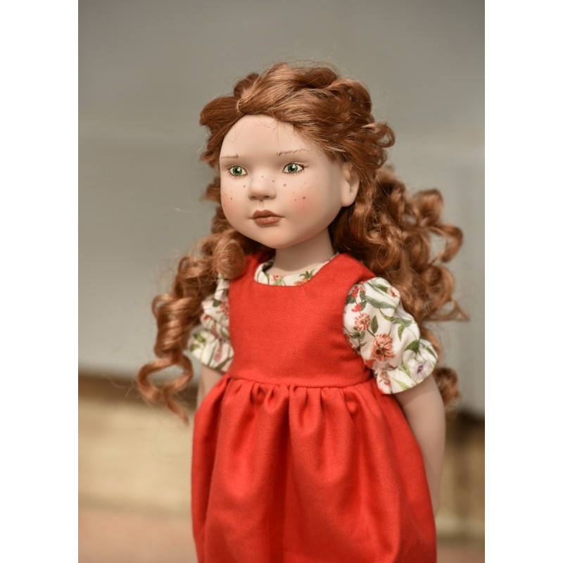 La poupée Nia - Moule 2022 (Comme Audrey) - Teint Porcelaine - a de longs cheveux roux bouclés, des taches de rousseur et les yeux verts.