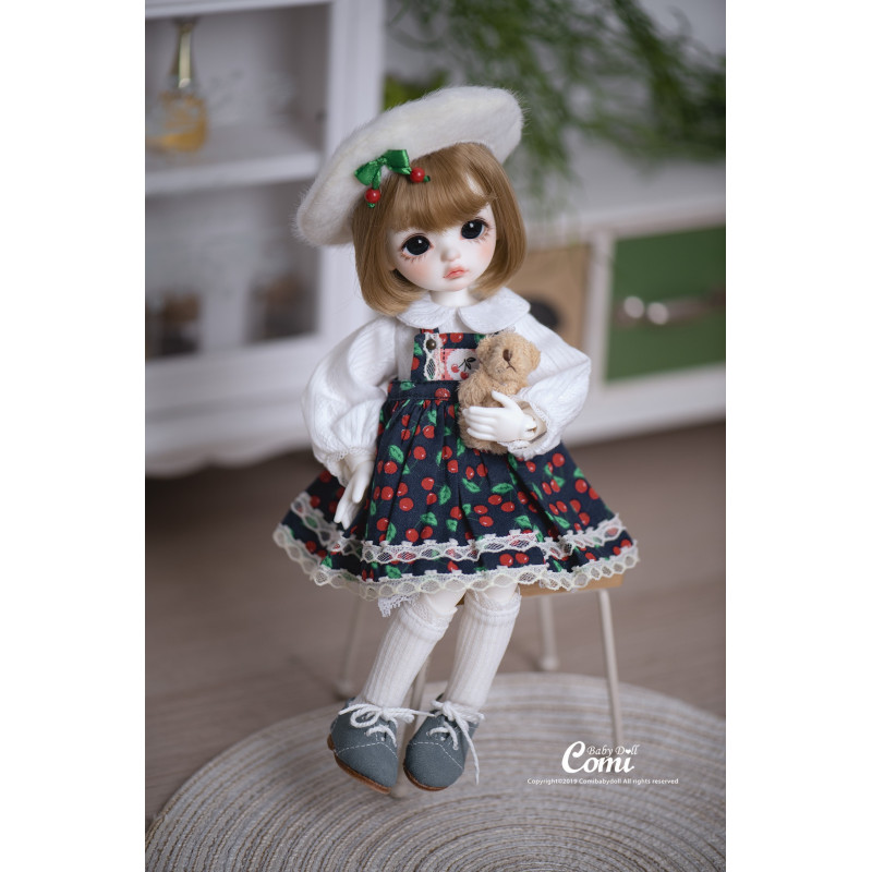 Notre demoiselle Cutie Momo, porte une jolie robe marine sans manches (parsemée de petites cerises), sur une blouse blanche et un jupon (avec dentelle).