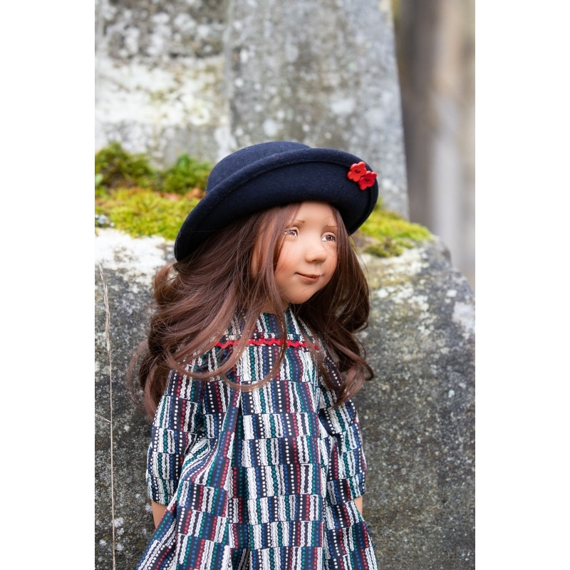 Gianna porte une ravissante robe imprimée et un chapeau en feutrine bleu marine.