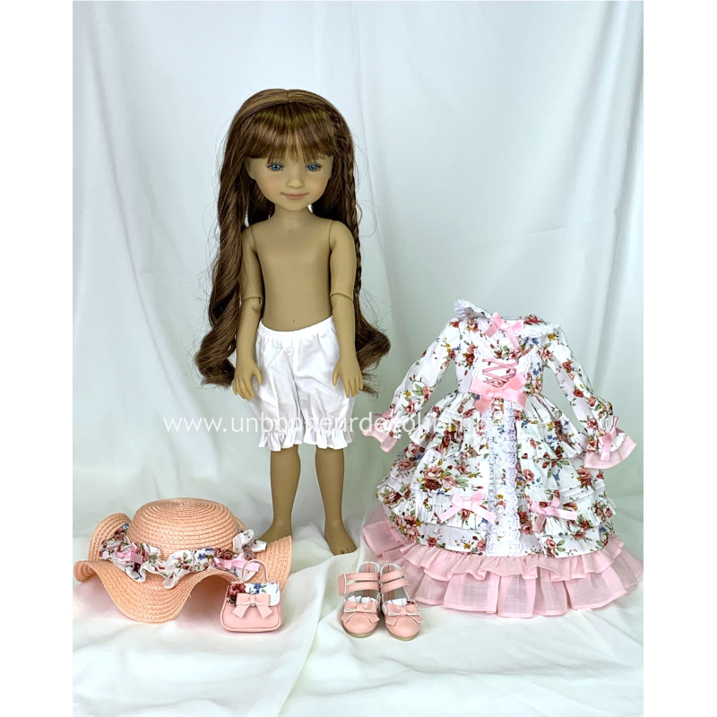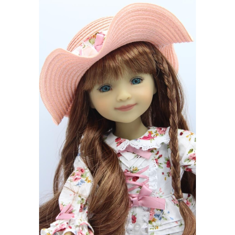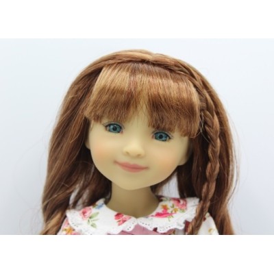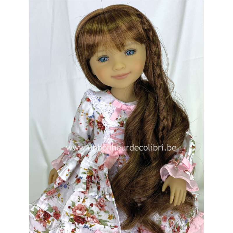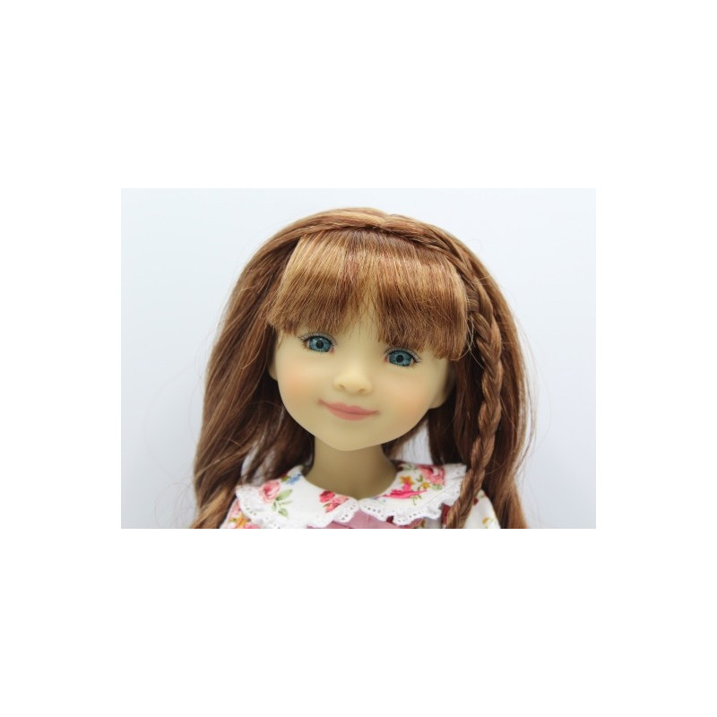 La ravissante poupée Bella HummingBird, aux cheveux brun auburn et aux yeux bleu-turquoise se présente comme suit :