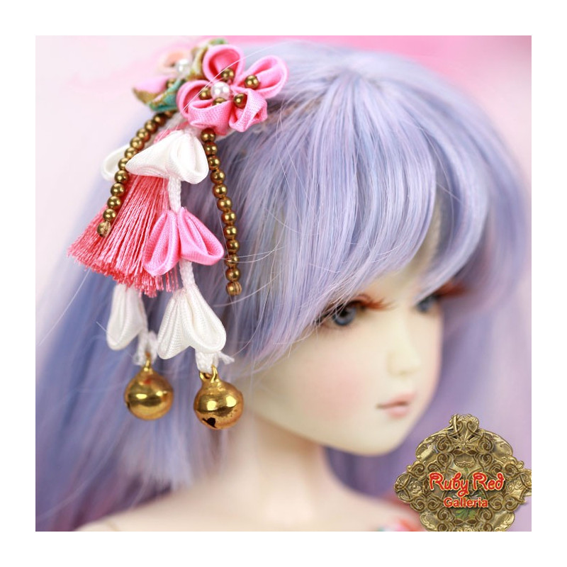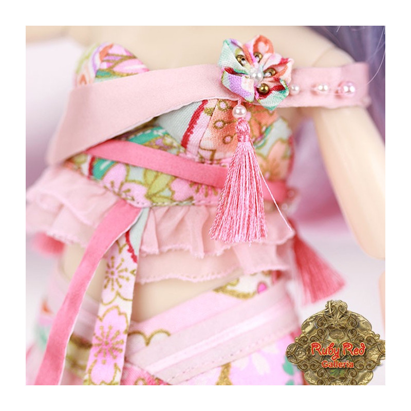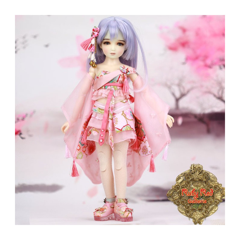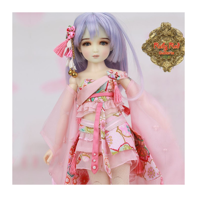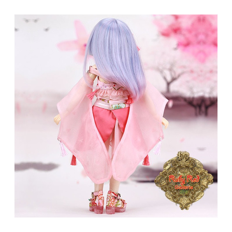 Lia Sakura a des cheveux lilas doux avec une belle coiffe florale. Elle porte une tenue de style japonais avec un motif Sakura.